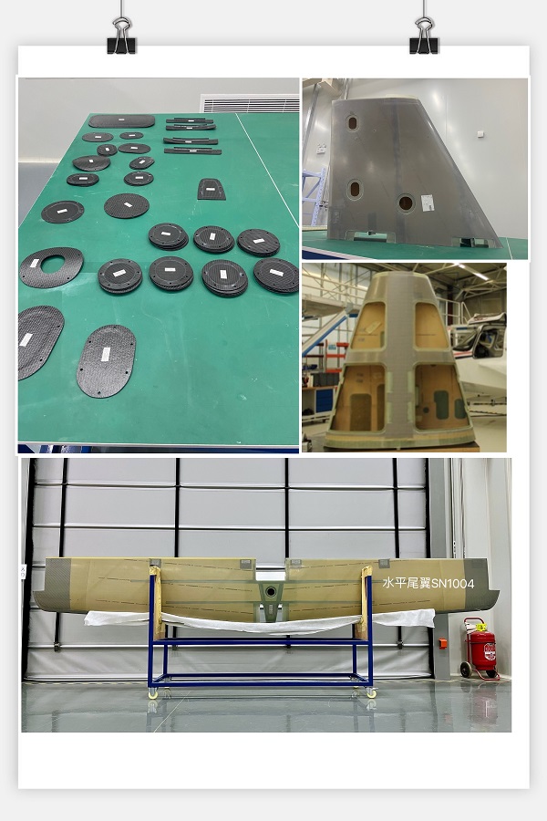 架次飞机的平尾、垂尾、检修口盖、雷击测试件和检具等复材组件生产,并于
