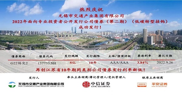 无锡交通集团于8月1日成功发行2022年面向专业投资者公开发行公司债券(第一期)(低碳转型挂钩),本期债券为江苏省内首单低碳转型挂钩公司债券,发行规模10亿元,发行期限为10年,票面利率为3.94%,创发行时期江苏省内同期限发行利率新低。本次债券是贯彻落实国家“碳达峰、碳中和”重大战略目标,支持无锡地方低碳转型发展、积极履行国有企业社会责任的有益示范。